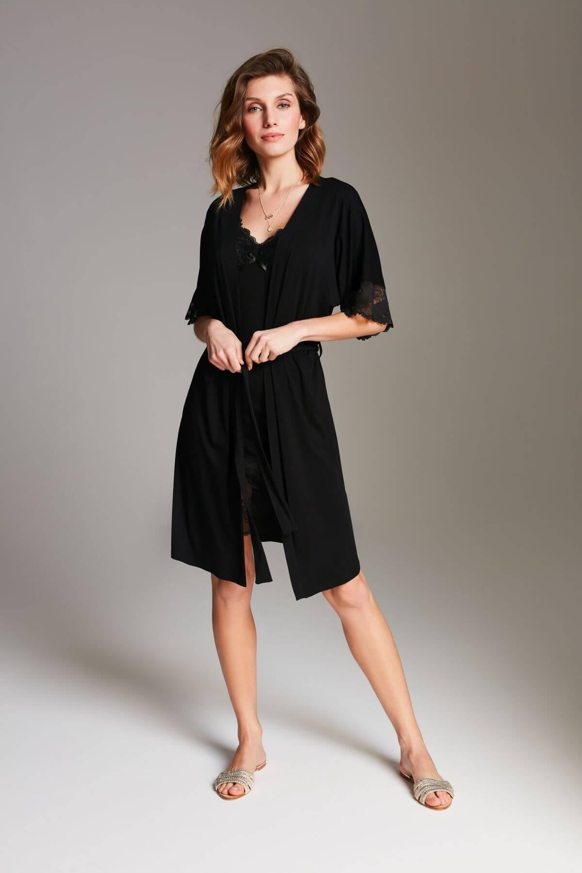 A black lace robe is a timeless classic, elegant, sensual and versatile. Delicate floral lace adorning the sleeves subtly reveals the skin, adding a unique character to the piece.The loose cut ensures full freedom of movement, while the waist tie allows the robe to be adjusted to the silhouette, highlighting its shape. The knee length makes it comfortable for everyday wear and perfect both for relaxation and special moments.Made from soft, skin friendly viscose knit, the robe also works perfectly as a stylish gift for an anniversary, birthday or other special occasion.