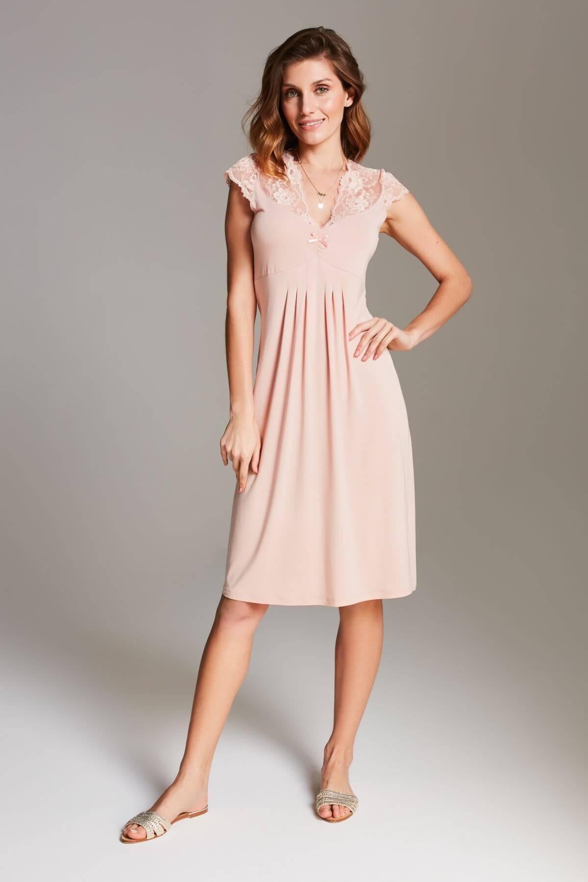 Dusty rose combines subtlety and romance. Lace at the neckline and sleeves that gently reveals the skin adds delicacy and feminine charm. A deep V neckline and a decorative bow at the cups emphasize the sensual character of the nightdress. Short lace sleeves and a lightly flared hem make it not only elegant but also very comfortable. An ideal choice for calm, relaxing evenings.