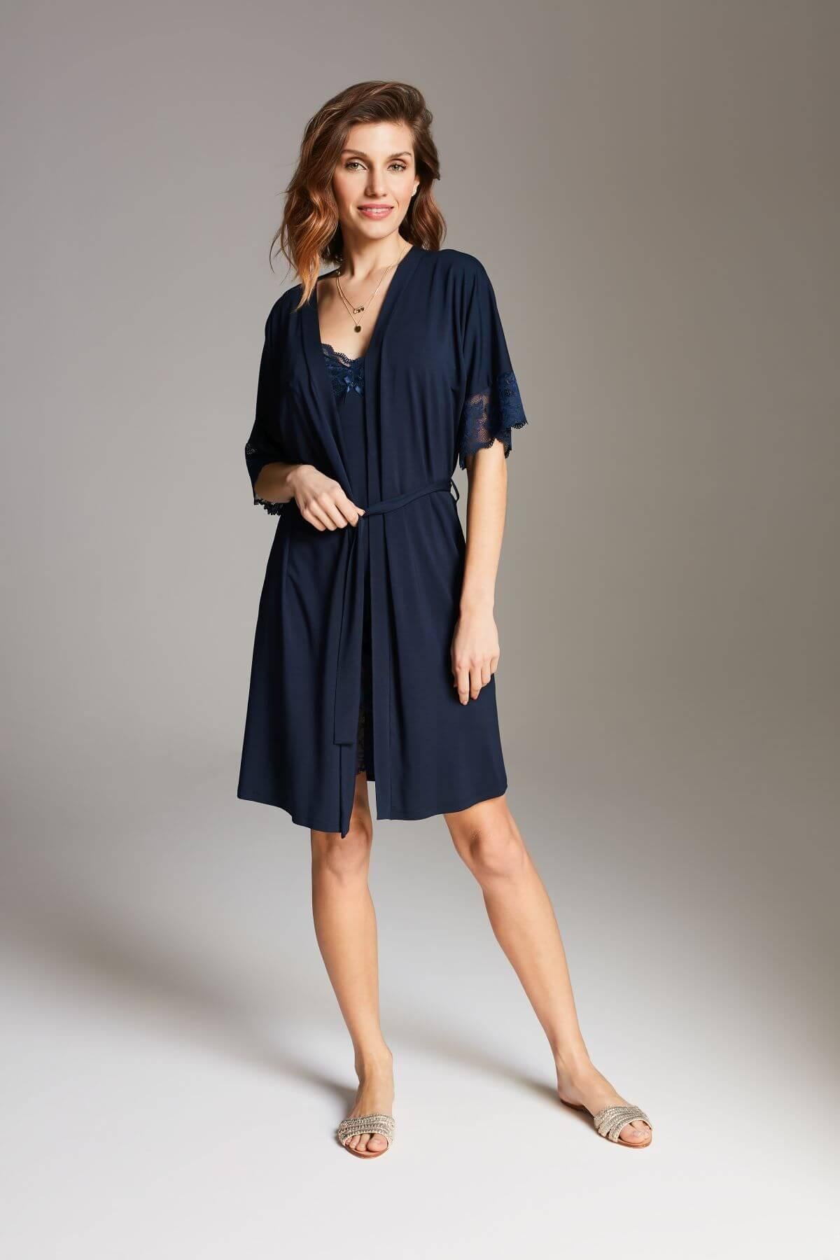 A navy blue lace robe is a balanced combination of elegance and comfort. Delicate floral lace on the sleeves gives it a romantic, feminine character.The loose, relaxed cut ensures comfort when worn, while the waist tie allows the robe to be subtly adjusted to the silhouette. The knee length makes it perfect both for everyday relaxation and special moments.Made from soft, breathable viscose knit, the robe in a deep navy shade is a timeless choice that adds class to any home look.