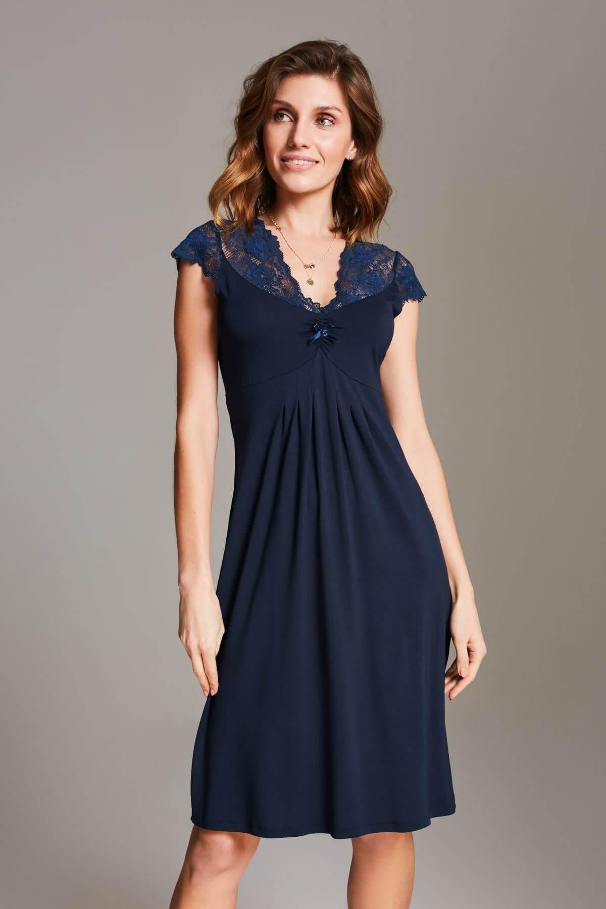 Navy nightdress is elegance in a night-time edition. Sensual lace at the neckline and sleeves, gently revealing the shoulders, gives it a romantic and subtle character. A deep V neckline and a decorative bow at the bust line create an elegant, feminine cut. Short lace sleeves and a lightly flared hem ensure comfort and lightness, ideal for calm, relaxing evenings.