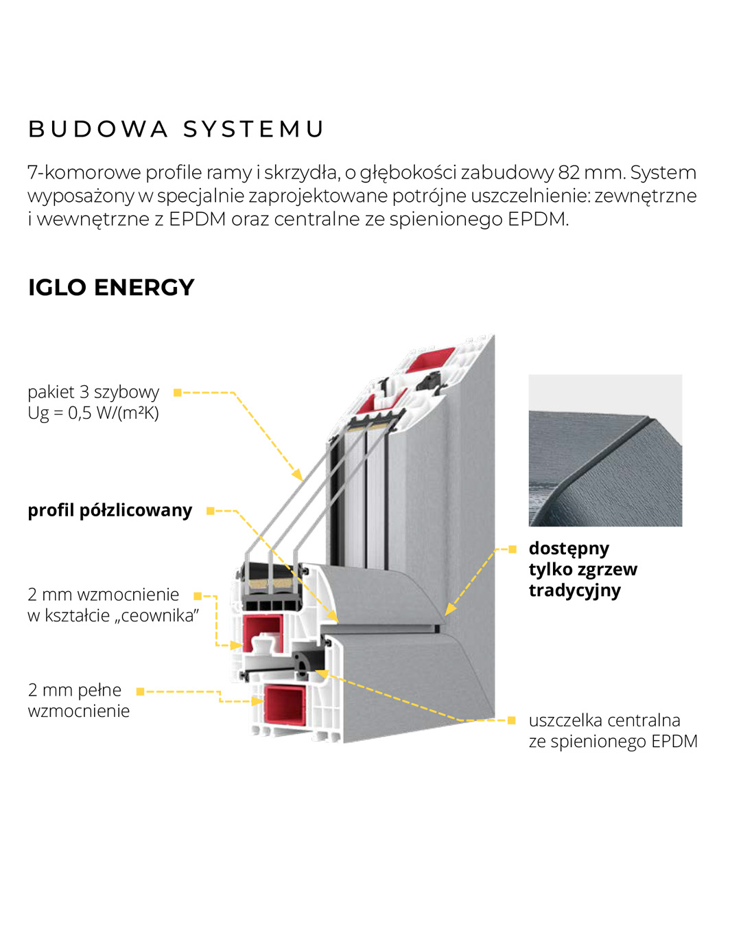 Innowacyjne okna, posiadają autorski 7-komorowy profil klasy A, wykonany wyłącznie z materiału pierwotnego. Pierwszy na świecie system okienny wykorzystujący uszczelkę centralną ze spienionego EPDM, co jest gwarancją najlepszych parametrów energooszczędności. Okna Iglo Energy wyróżniają się również doskonałymi parametrami pod względem wodoszczelności, mikrowentylacji i odporności na wiatr.