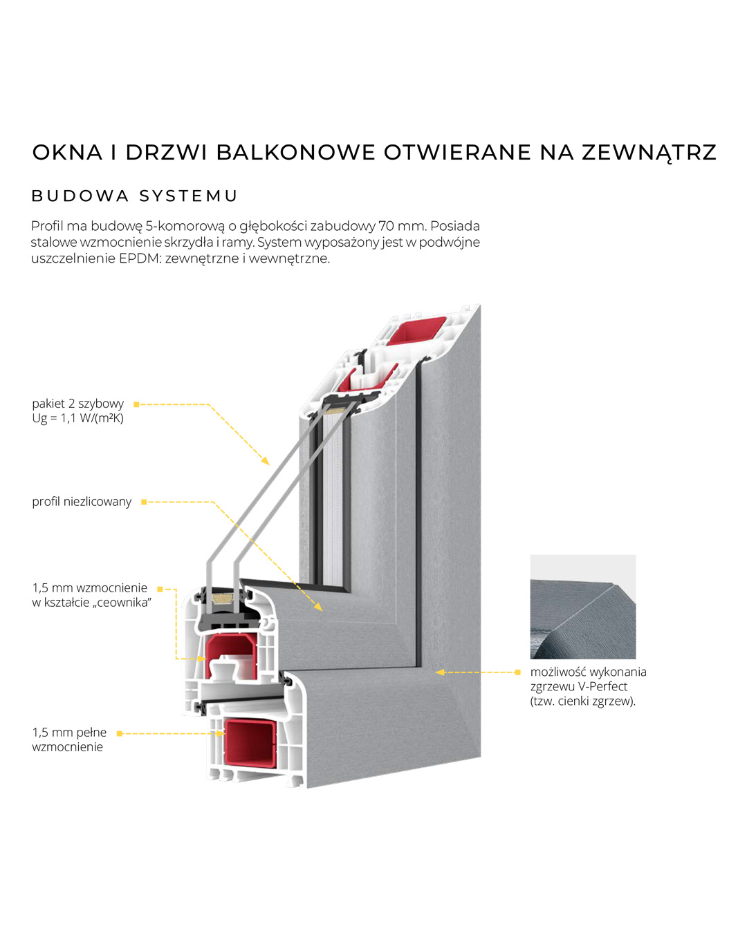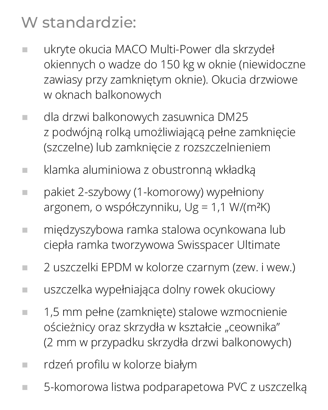 Specjalnie zaprojektowane, oryginalne okna i drzwi balkonowe otwierane na zewnątrz. Atrakcyjny design i bardzo dobre parametry izolacji termicznej oznaczają cieplejszy dom przy niższych kosztach ogrzewania.
