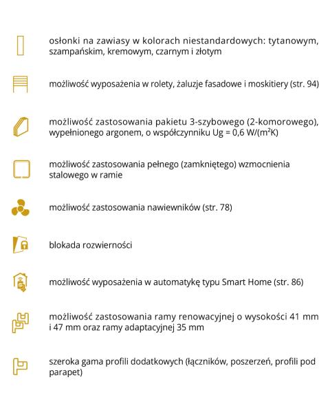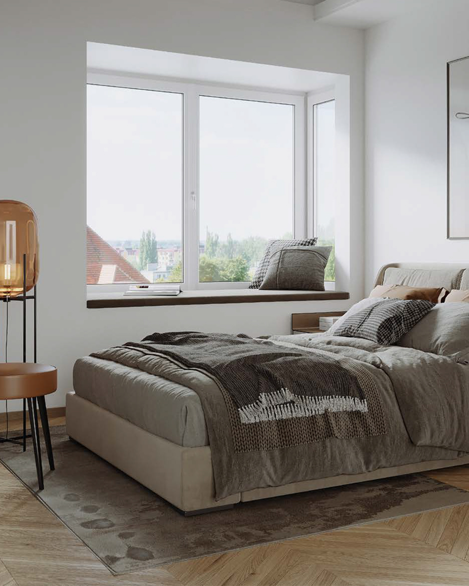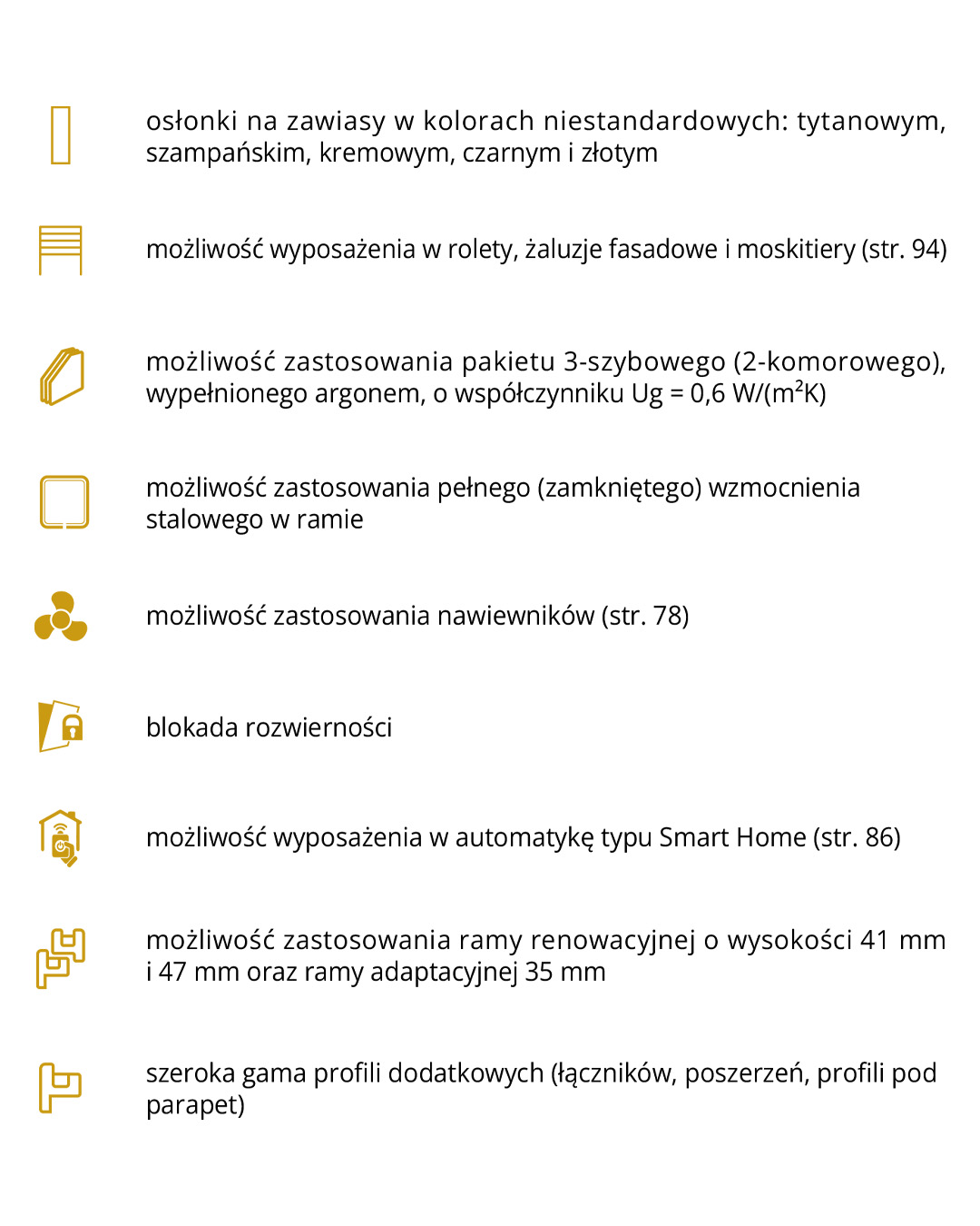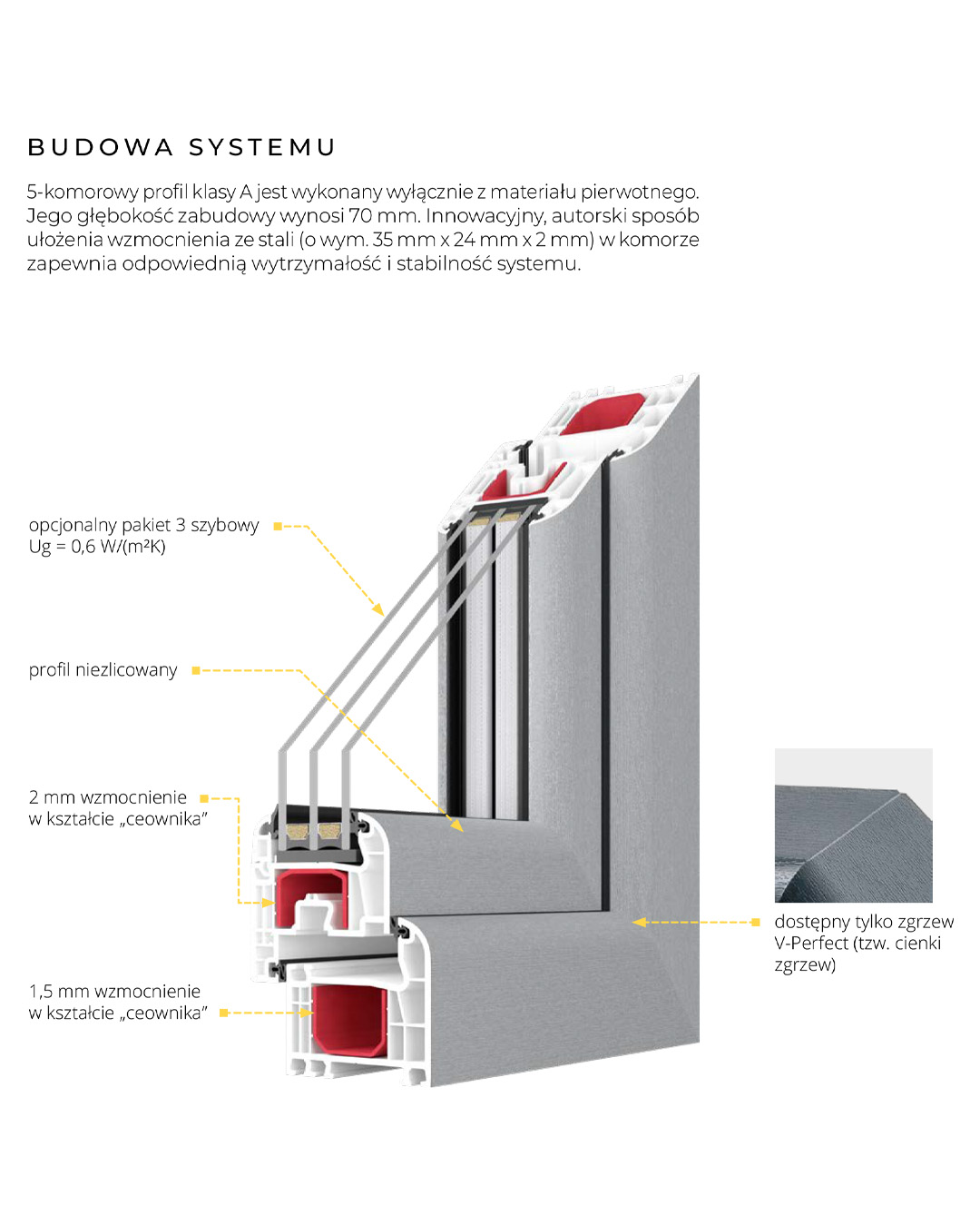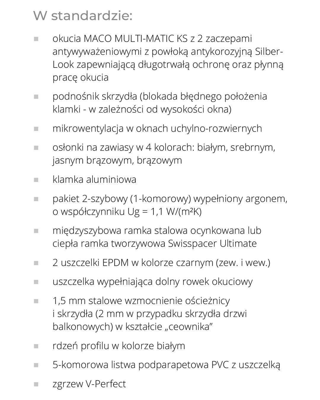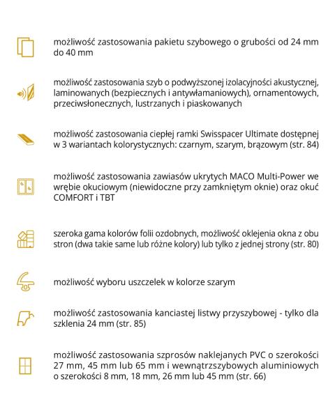 Jeszcze więcej światła i zadowolenia z użytkowania. Design Iglo Light wyrażony jest zaokrąglonym kształtem oraz smukłymi i wąskimi liniami profilu. W porównaniu do tradycyjnych systemów charakteryzuje się o 32% węższym ruchomym słupkiem z symetrycznie umieszczoną klamką aluminiową oraz o 8 mm niższym profilem skrzydła.