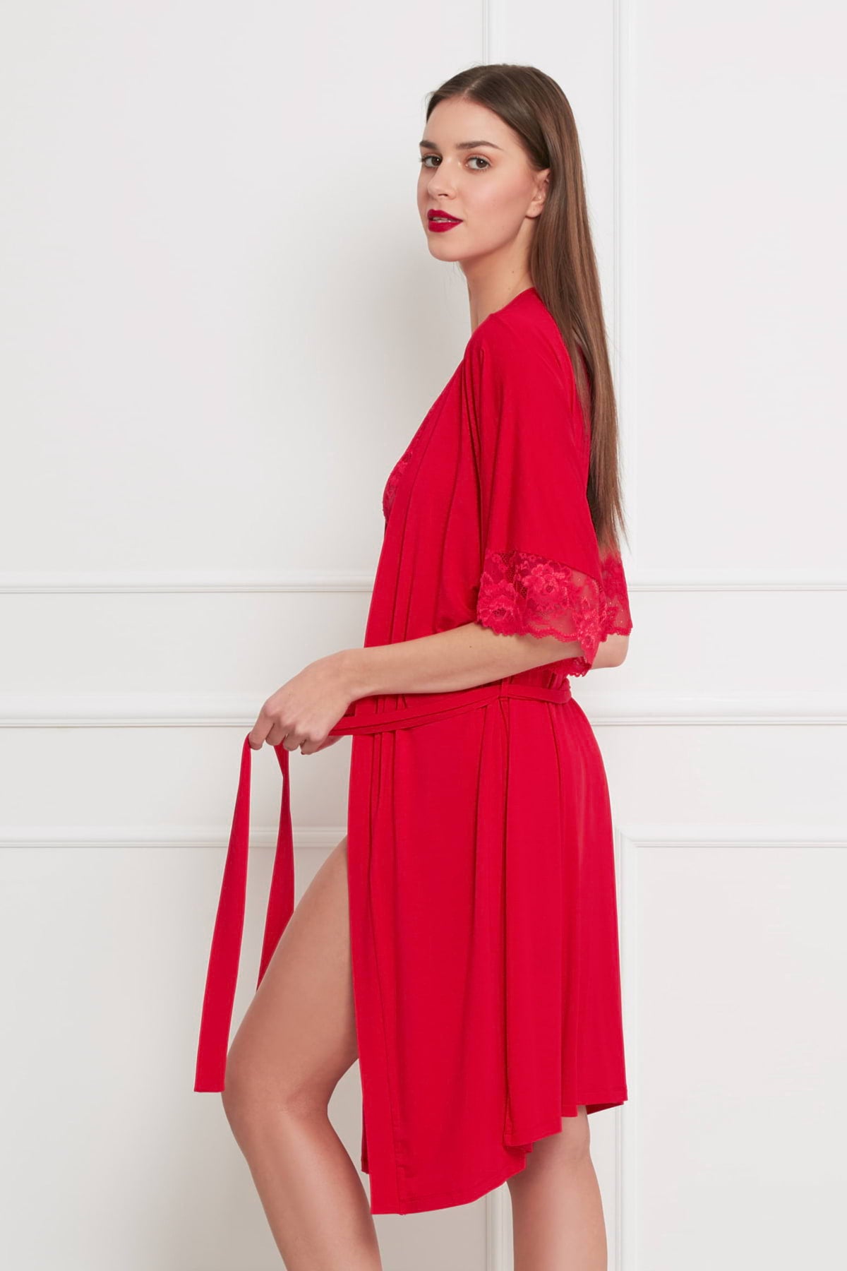 A red robe is a bold choice for women who want to emphasise their confidence and femininity. Delicate lace on the sleeves adds subtle charm, while the intense colour draws the eye.The loose cut and waist tie allow the fit to be perfectly adjusted to the silhouette, while ensuring freedom of movement and comfort. The knee length makes it an excellent choice for calm evenings or romantic moments.Made from soft, breathable viscose knit, the robe wraps the skin in comfort, both at home and as a sensual gift.