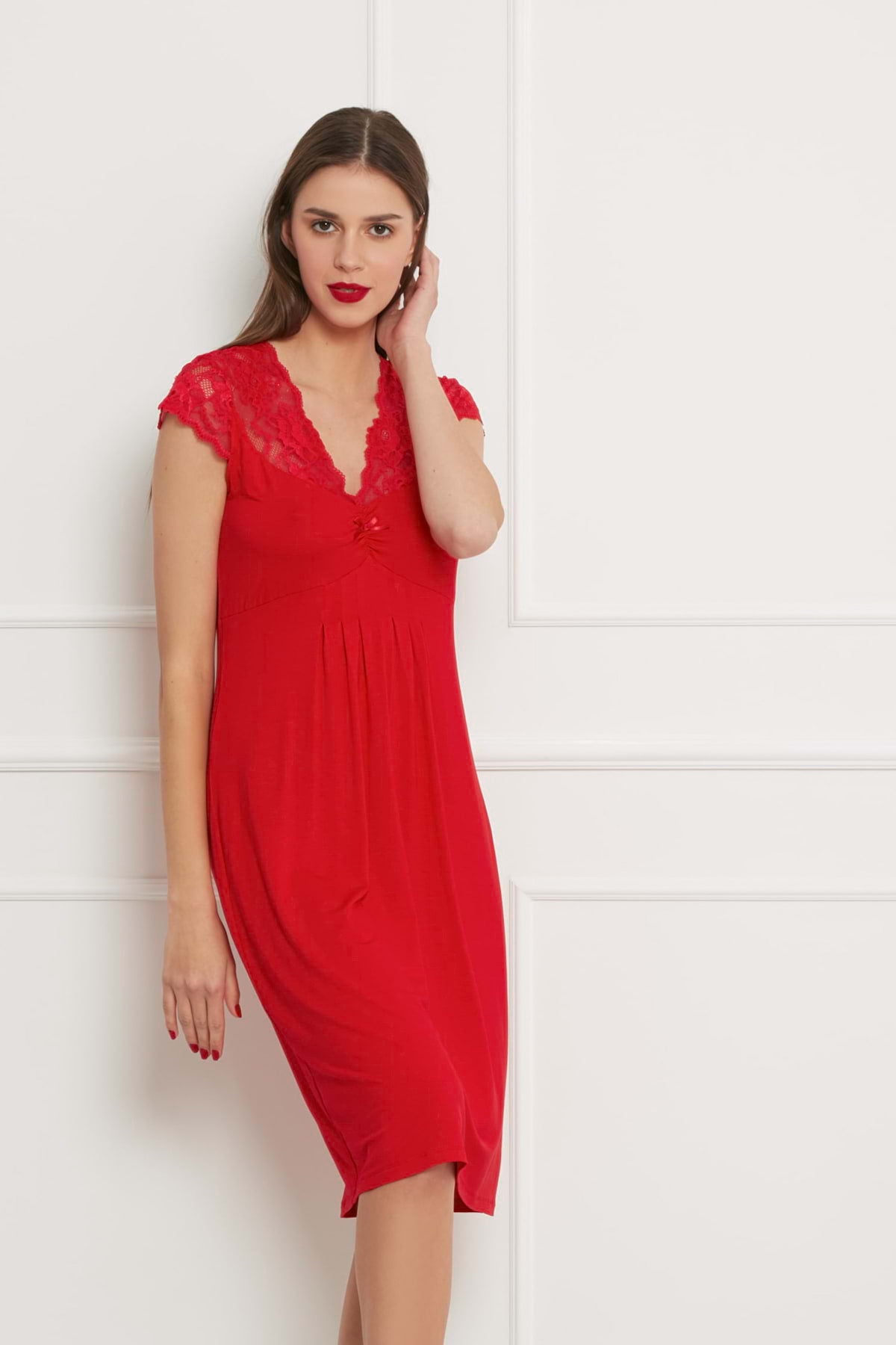 Red nightdress is a sensual choice for a confident woman. Lace at the neckline and sleeves subtly reveals the shoulders, giving the piece a romantic and feminine character. A deep V neckline and gathers at the cups finished with a bow add sensual appeal, while short lace sleeves and a lightly flared hem bring lightness and comfort. An ideal option for evenings when you want to feel special and at ease.