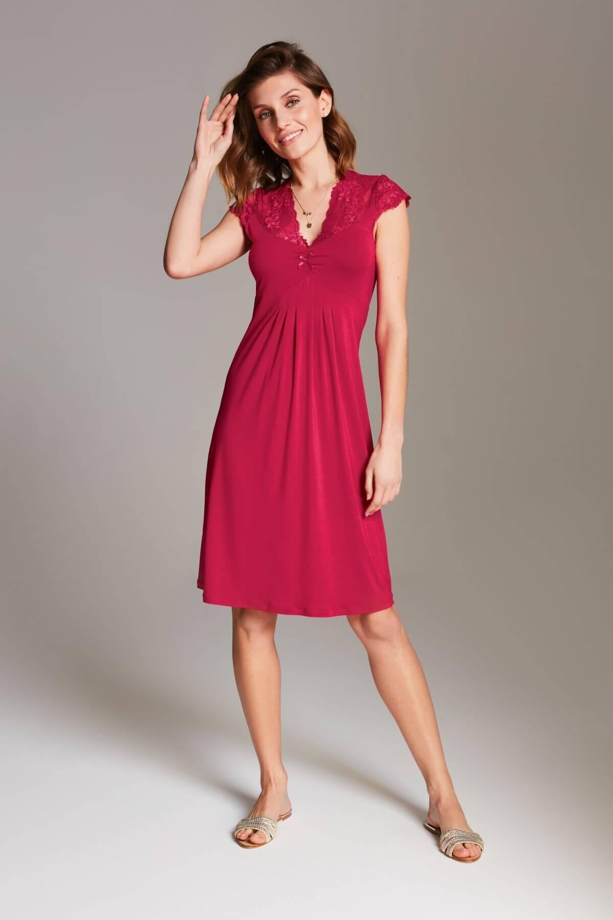 Ruby nightdress is a blend of passion and delicacy. Lace adorning the neckline and sleeves subtly reveals the skin, adding elegance and romantic charm to the whole. A deep V-shaped neckline highlights the line of the neck, while gathers at the cups finished with a bow give the nightdress a sensual, feminine character. Short lace sleeves and a flared hem create a harmonious, comfortable silhouette – perfect for special evenings.