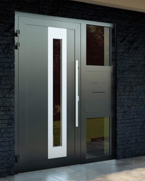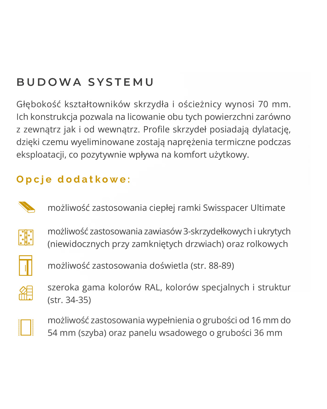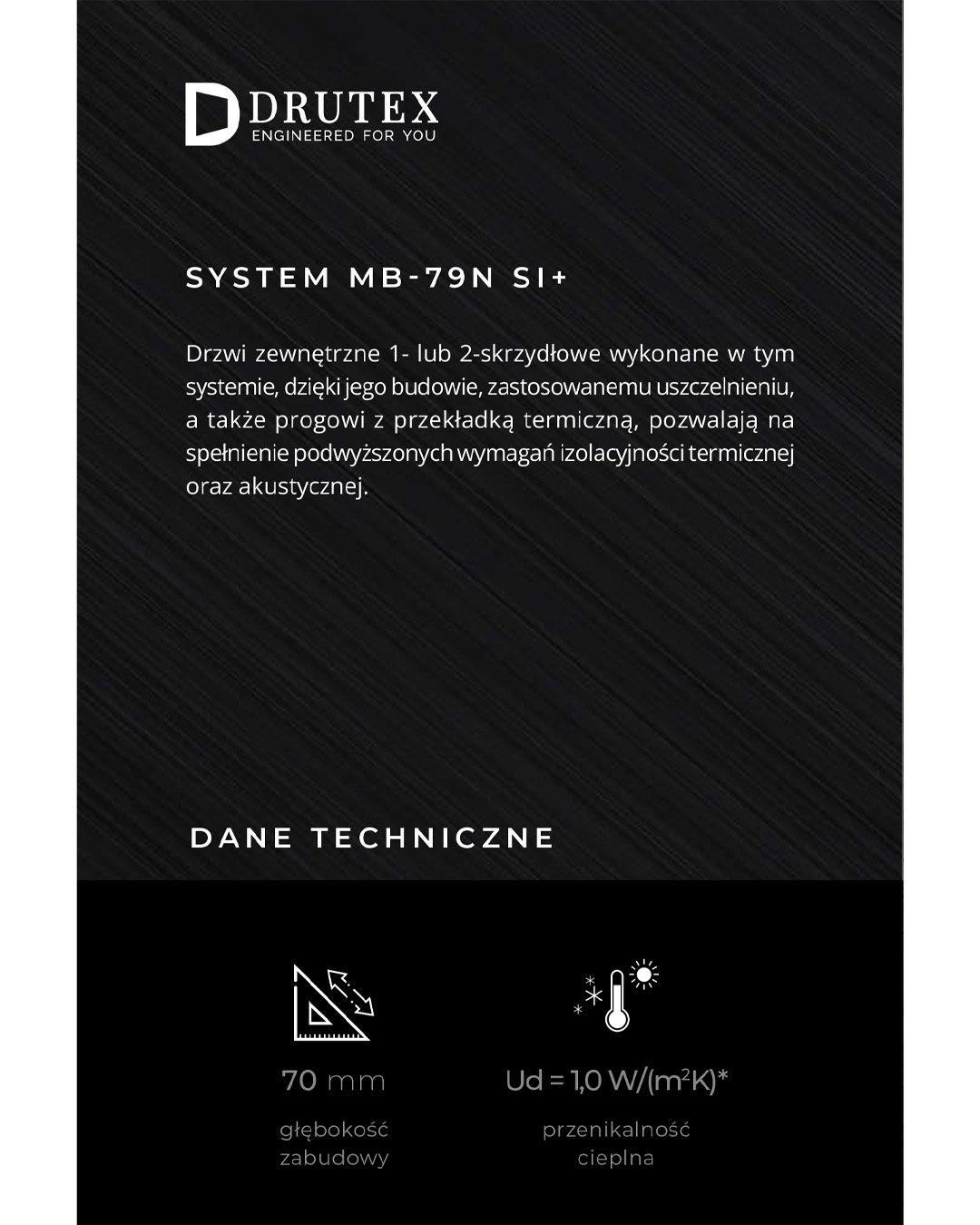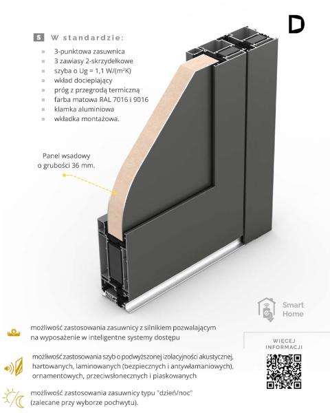 Drzwi aluminiowe zewnętrzne 1- lub 2-skrzydłowe. Dzięki ich budowie, zastosowanemu uszczelnieniu, a także progowi z przekładką termiczną, pozwalają na spełnienie podwyższonych wymagań izolacyjności termicznej oraz akustycznej drzwi.