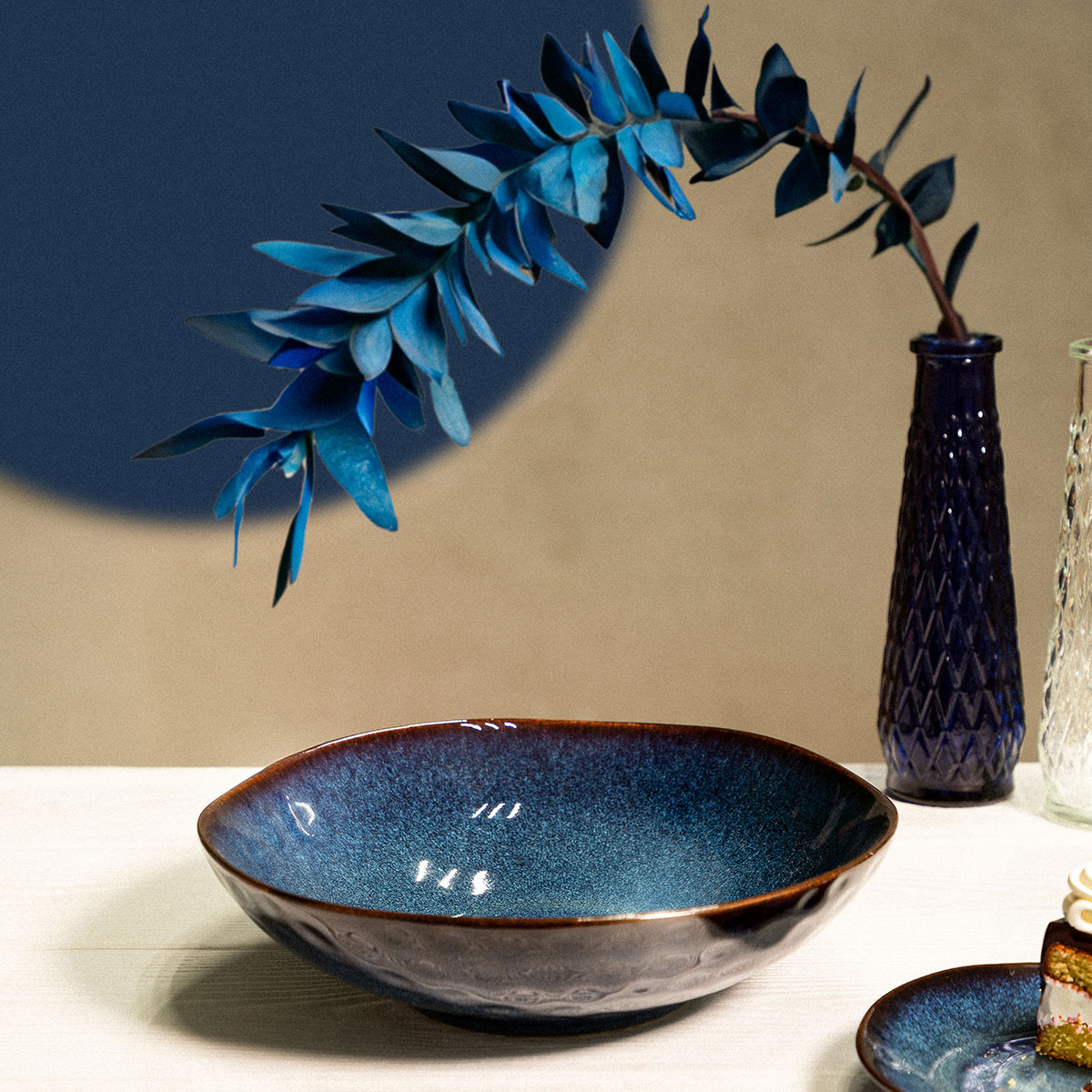 Kamionkowa misa HOMLA CASPER pozwoli Ci w elegancki sposób zaserwować chrupkie przekąski oraz sałatki podczas wizyty gości czy luźnego spotkania ze znajomymi. Naczynie ma granatowy kolor, który zachwyca głębią i płynnie łączy się z brązową linią krawędzi. Wspaniale będzie wyglądała na drewnianym stole, a także na tle eleganckiego obrusu.