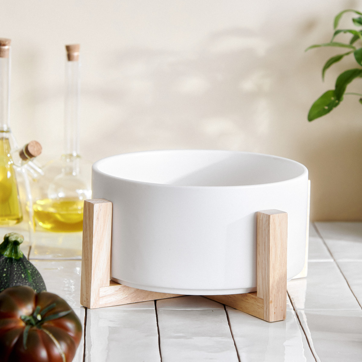 Misa ceramiczna biała na drewnianej podstawce