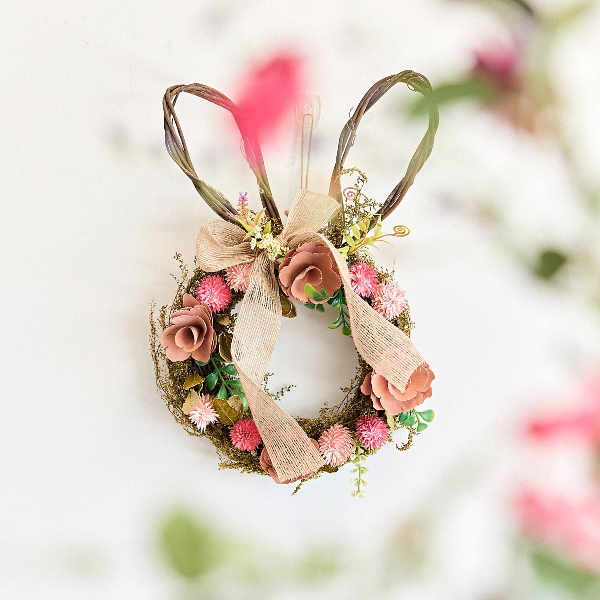 Wiszący stroik wielkanocny – królik z różowymi kwiatkami